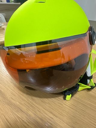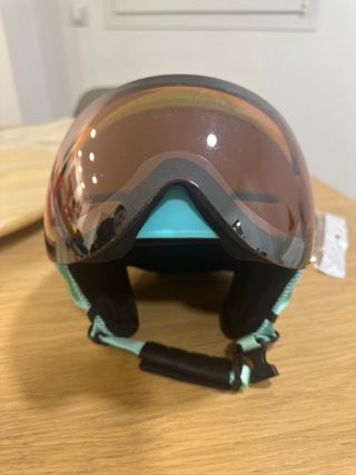 Casco para esquí o snowboard, con visor integrado. - Visor con acabado espejo. - Correa ajustable con cierre de seguridad. - Diseño moderno y cómodo.