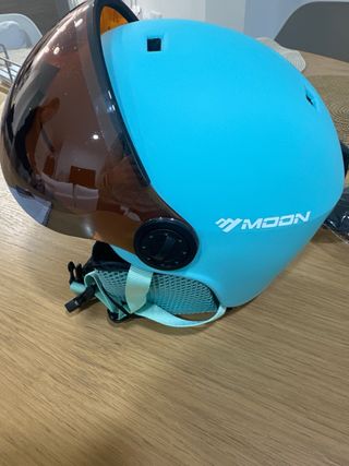 Casco de esquí o nieve de color amarillo brillante con visera. - Marca: MOON - Color: Amarillo neón - Visera integrada - Cierre de seguridad - Incluye bolsa de transporte negra