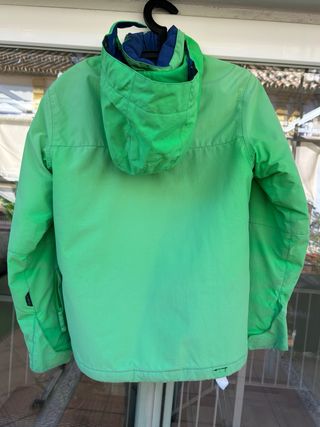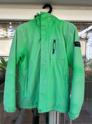 Chaqueta de esquí Quiksilver en color verde brillante, talla 12. Ideal para actividades en la nieve. - Cierre frontal con cremallera. - Bolsillo en el pecho con cremallera. - Puños ajustables. - Capucha extraible - Bolsillo en extremo manga para forfait - falda ajustable para nieve