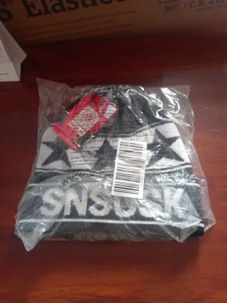 Gorro de esquí profesional con diseño de estrellas y texto. - Diseño de estrellas en blanco y negro. - Texto SNSUSK en la parte inferior. - Incluye etiqueta roja. 0439, hago envios. Vale nuevo 14 euros y este está sin estrenar.