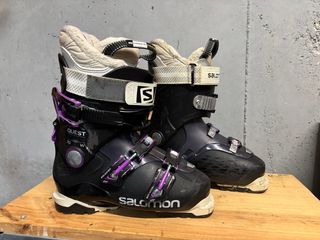 Botas de esquí Salomon Quest 70W en talla 25 (38-40). - Color negro y morado. - Cierre con ganchos y velcro. - Diseño Quest.