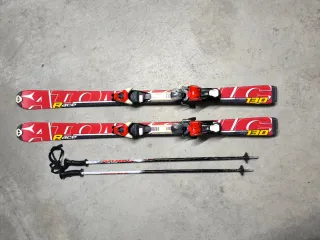 Conjunto de esquís ATOMIC Race para niños, listos para la nieve. - Esquís ATOMIC Race de 130 cm. - Fijaciones de esquí ATOMIC. - Bastones de esquí negros con empuñaduras rojas.