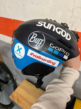 Los reflejos de la foto son gotas de agua, que esta mojado, muy calentito, muy bueno Casco de esquí de la marca Briko, ideal para descensos en la montaña. - Color azul claro. - Diseño con ventilación. - Correa de ajuste.