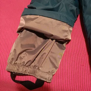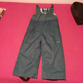 Peto de esquí marca del decathlon, talla 2-3 años. Tiene elástico en la parte inferior de la pernera para ajustar el largo, y goma para enganchar por debajo de la bota. Cremallera diagonal, y tirantes ajustables. Además manoplas para la nieve a juego con dibujo de pingüino. Tienen goma para ajustar a la muñeca y clip para juntarlas y no perderlas. Todo en tonos verdes. Ambas cosas usadas un sola vez.