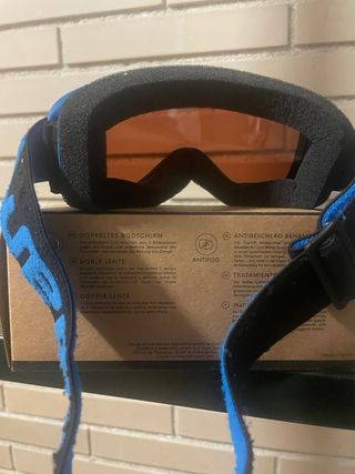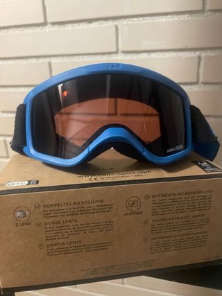 Gafas de esquí para niño con lente doble y tratamiento antivaho. Para edades de 3-7 años. Como nuevas. - Doble lente para evitar empañamiento. - Tratamiento antivaho para mayor visibilidad. - Montura azul. - Correa ajustable.