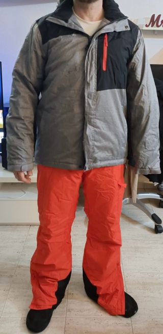 Conjunto de chaqueta y pantalón de esquí de la marca Mountain Peak. Talla M (un poco grande, puede pasar por una L). - Chaqueta gris y negra con detalles rojos. - Pantalón de esquí naranja. - Diseño deportivo.