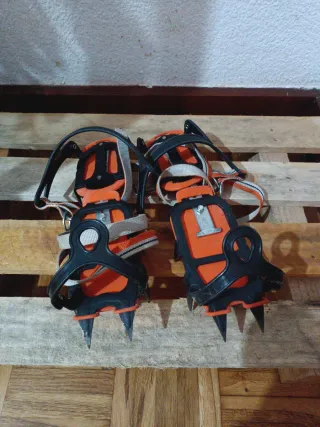Crampones diseñados para actividades de montaña y senderismo. - Color naranja y negro. - Correas ajustables para sujeción. - Puntas metálicas afiladas.