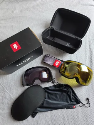Gafas de ventisca de la marca Majesty, ideales para esquí. Incluyen una lente amarilla y otra oscura. - Lente principal amarilla. - Lente secundaria oscura. - Correa con diseño. - Incluye funda protectora.