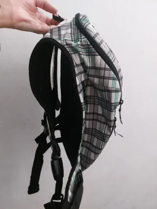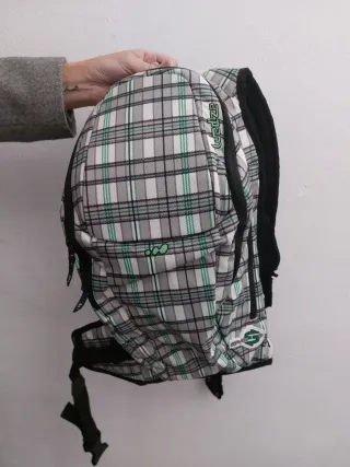 Mochila con un diseño a cuadros en tonos grises, blancos y verdes. Perfecta para llevar tus cosas. - Diseño a cuadros. - Cierre de cremallera. - Correas ajustables.