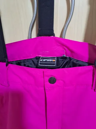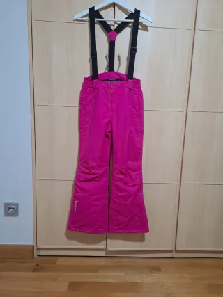 Pantalón de nieve rosa con tirantes ajustables. Ideal para disfrutar de la montaña. -Marca ICEPEAK. -T/11-12,152cm. - Color rosa vibrante. - Tirantes negros. - Diseño con cremalleras y bolsillos.