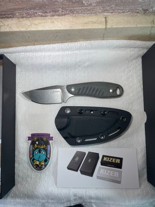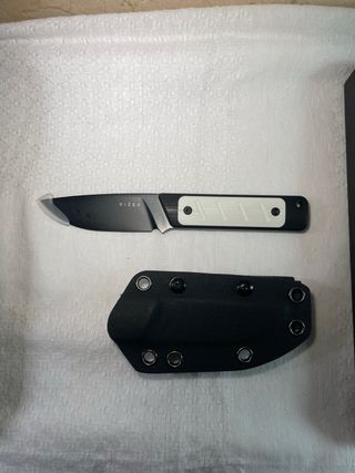 Cuchillo fijo Kizer Smolt (modelo 1063A3), original, tal como se muestra en las fotos. Diseñado para uso outdoor, camping, bushcraft y EDC. Características oficiales del fabricante: • Diseño de hoja fija con perfil eficiente para corte general • Material de hoja: CPM 3V (acero de alto rendimiento) • Empuñadura en G10 negro y blanco • Incluye funda rígida (Kydex) para transporte seguro • Diseñado por Jonathan Styles • Tamaño total aproximado: 6.5 pulgadas (como indica la caja) Producto original Kizer Smolt 1063A3, con su funda incluida.