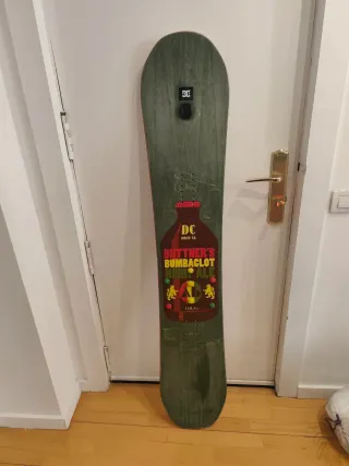 Tabla de snowboard DC Pro Mega Aaron Bittner con un diseño único inspirado en una botella de cerveza. - Modelo: Aaron Bittner Pro Mega. - Medida: 156.5 cm. - Diseño: Buttner's Bumbaclot Hemp Ale con gráficos de botella de cerveza. - Logo DC Brew Co. en la parte superior.