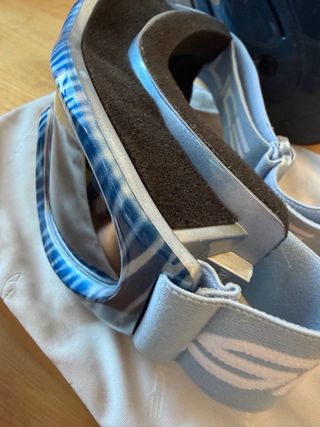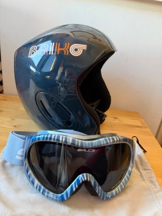 Conjunto de esquí para chica que incluye casco y gafas. - Casco de esquí azul de la marca Brico - Gafas de esquí con diseño a rayas azules y blancas de la marca Salice - Incluye funda para las gafas. Literalmente usado 5 dias, el tiempo que se ha dado cuenta mi pareja que lo suyo no es el esqui.