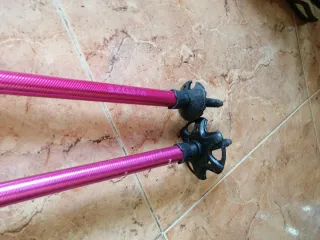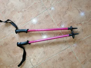 Par de bastones de esquí para niños, con un llamativo color rosa.Una roseta se perdió y la cambié, sale en la foto. - Mangos ergonómicos de color negro. - Correas de sujeción negras. - Discos de tracción negros.