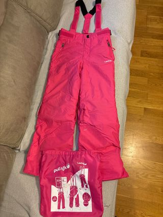 Pantalón de esquí rosa de la marca Wed'ze, modelo Pull'nfit, para talla 8 años. Ideal para disfrutar de la nieve. Pantalón con gomas en los lados que le hacen estirarse o encogerse según la edad del niño. Usado tres fines de semana. - Color rosa vibrante. - Sistema Pull'nfit para ajuste. - Tirantes ajustables. - Cremalleras en los bolsillos.