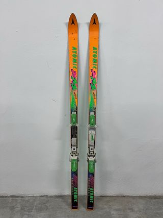 Conjunto de esquís vintage Atomic Impulse. - Diseño en color naranja vibrante. - Fijaciones incluidas.