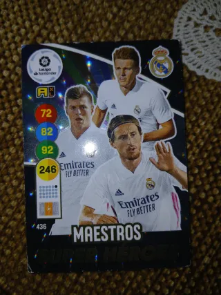 Carta coleccionable de fútbol del Real Madrid, edición Maestros. - Incluye los jugadores Kroos, Modric y Odegaard , Carrasco, Marcos llorente y Joao Félix , Trincao , Pedri y Ansu Fati - Con estadísticas de juego. - Diseños brillantes y detallados. ME PODEIS ESCRIBIR POR LA CARTA QUE QUERAIS