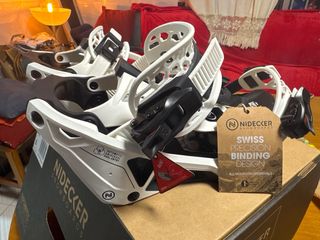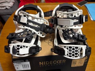 Fijaciones de snowboard Nidecker Supermatic en color blanco y talla S. Diseñadas para un sistema de entrada automática y universal. - Modelo: Supermatic - Color: Blanco - Talla: S (MP22.0-23.5) - Tipo de entrada: Automática, Universal, Dual-Entry - Marca: Nidecker