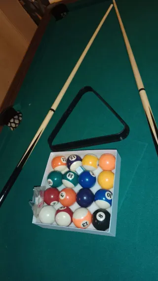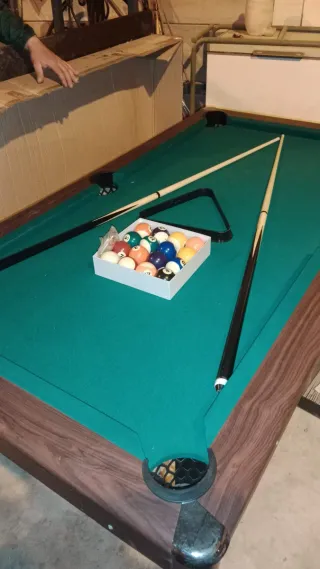 Mesa de billar lista para jugar. Incluye todo lo necesario para empezar una partida. - Bolas de billar numeradas. - Triángulo para colocar las bolas. - Dos tacos de billar. Medidas 184x102x78 Incluye juego de bolas Triangulo y 2 palos ((((((Sólo recogida en persona no se envía))))))))))))))