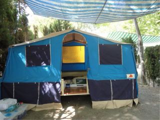 Carro tienda de campaña para camping, ideal para escapadas al aire libre. - Estructura resistente y duradera. - Diseño práctico y funcional. - Fácil de montar y desmontar. Tiene dos camas de 1,35 separadas por pasillo central. Cremalleras en buen estado. Amplio avance con sus cortinas. Dispone de cofre para almacenamiento. Con su documentación. No, negociable!