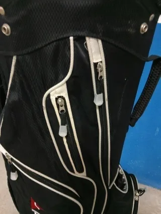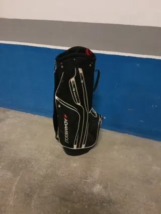 Bolsa de golf de la marca Adams Golf en color negro. - Diseño con múltiples compartimentos. - Cremalleras y asas. - Logotipo de la marca visible.