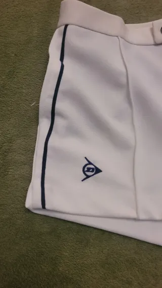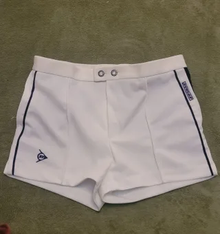 Pantalón corto de tenis vintage de la marca Dunlop. - Color blanco. - Detalle de ribete azul marino en los laterales. - Logo de Dunlop bordado en azul marino en la parte delantera. - Dos botones en la cintura.