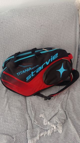 Paletero Starvie Tiranía Kepler en color negro y azul. Ideal para transportar tu equipación de pádel. Sin estrenar. - Diseño moderno y funcional. - Compartimentos amplios para palas y accesorios. - Cierre con cremallera.