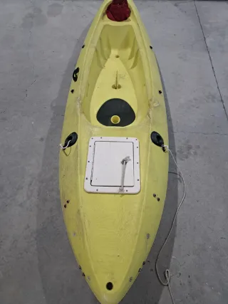 Kayak de un solo asiento en color amarillo. - Diseño abierto. - Compartimento de almacenamiento en la parte delantera. - Autovaciable Esta en unas condiciones normales, para empezar a probar la pesca en kayak por poco precio