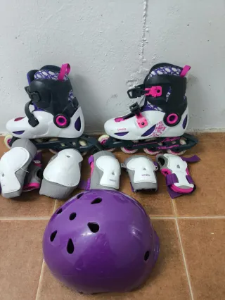 Conjunto de patines y protecciones para niños. - Patines ajustables en color blanco, morado y negro. - Incluye casco morado. - Juego de protecciones para rodillas, codos y muñecas. Talla 32-33-34 Casco talla 50-54