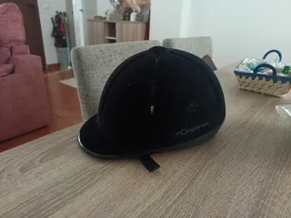 Casco de equitación de color negro, con acabado aterciopelado. - Marca: Fouganza - Diseño con visera. - Correa de ajuste.