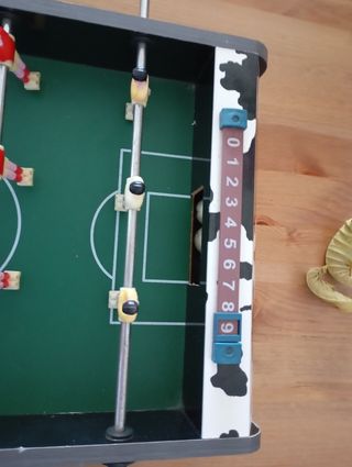 Futbolín de mesa con diseño divertido. - Campo de juego verde. - Jugadores de diferentes colores. - Marcador numérico. Una de las pelotas h a perdido los dibujos.