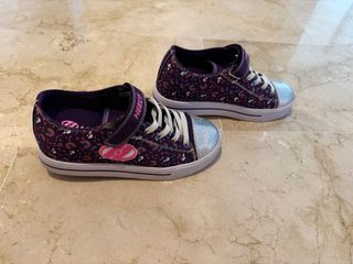 Zapatillas Heelys de color morado con ruedas. - Diseño con cordones blancos y velcro. - Punta con purpurina plateada. - Ruedas dobles en el talón.