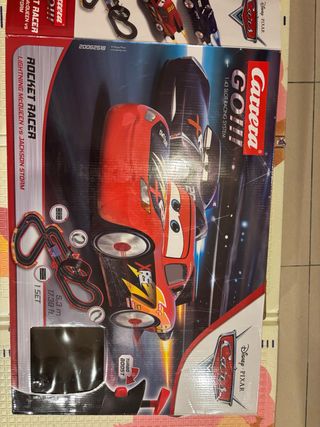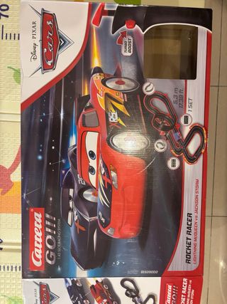 Circuito de slot Carrera GO!!! de Cars, modelo Rocket Racer. - Incluye los coches Lightning McQueen y Jackson Storm. - Escala 1:43. - Longitud del circuito: 5,3 m (17,38 ft). - Sistema de control con botón Turbo Boost.