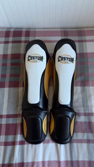 Tibiales de la marca Custom Fighter en color negro y dorado. Están prácticamente nuevos, los vendo porque me lesioné y no puedo entrenar más.