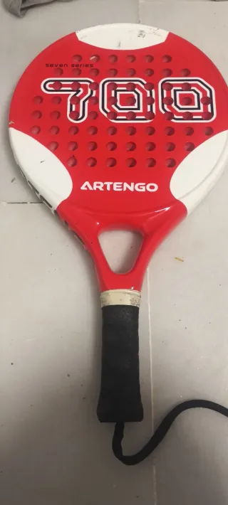 Pala de pádel Artengo modelo 700, serie Seven. - Pala de pádel de color rojo y blanco. - Diseño con el número 700. - Marca Artengo.