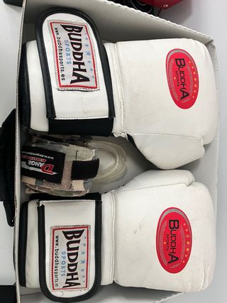 Set de guantes de boxeo de la marca Buddha Sports. - Color blanco. - Cierre de velcro. - Incluye vendas.