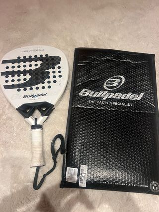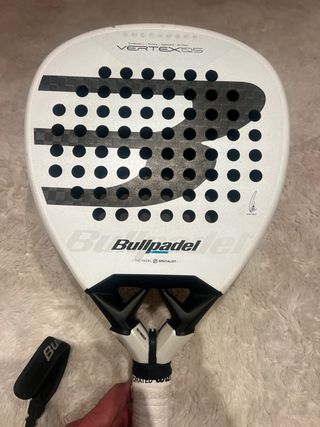Pala de pádel Bullpadel Vertex 05.Juan Tello. Regalo de Reyes. La pala se vende por lesión, tiene como se aprecia en la imagen un golpe en una de las caras, pero no influye en nada,ni se ha dañado mas ya que la raja no es profunda
