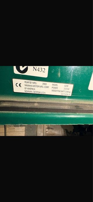 Buggy de golf Yamaha modelo G22E, fabricado en 2003. - Motor: 2.0 KW - Peso (sin batería): 249 kg - Fabricante: Yamaha Motor Mfg. Corp. of America - Ubicación: Newnan, Georgia, USA - Número de serie: JU2-F4236-10