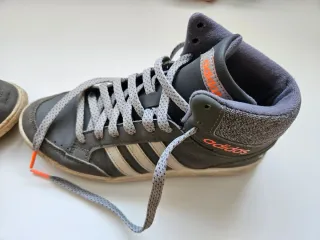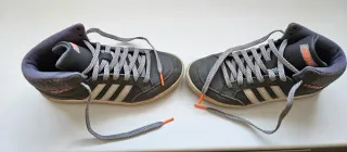 Botas deportivas Adidas de caña alta en talla 38. El diseño es en color gris oscuro con detalles en blanco y naranja. - Cierre con cordones. - Logo de Adidas en el lateral y la lengüeta. - Suela de goma.