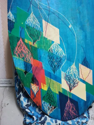 Tabla de skimboard. - Base con patrón de rombos y líneas. - Dibujos de elementos orgánicos colgantes. - Tonos azules, verdes, rosas y amarillos.