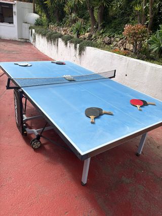 Mesa de ping pong de color azul, ideal para disfrutar en exteriores. - Estructura plegable con ruedas para fácil transporte. - Red de separación incluida.