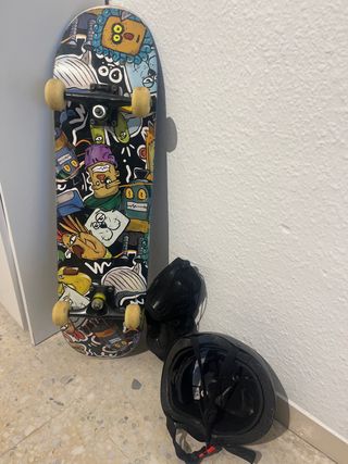 Tabla de skate con un diseño divertido y colorido, ideal para empezar a practicar. Tiene uso pero esta en muy buen estado, lo que se ve es gastado de roces pero la estructura esta perfecta. Lo compre para una niña de 6 años pero es tamaño adulto 78 cm aprox largo Incluye casco y protecciones. - Tabla de skate - Casco negro. - Juego de rodilleras, coderas y proteccion para las manos.