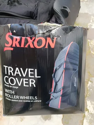 Bolsa de viaje Srixon con ruedas, diseñada para transportar palos de golf. - Color negro. - Logo Srixon visible. - Diseño con ruedas para facilitar el transporte. - Material resistente.