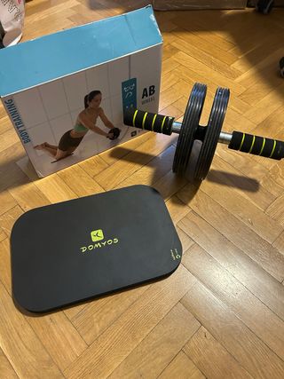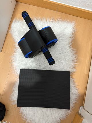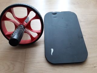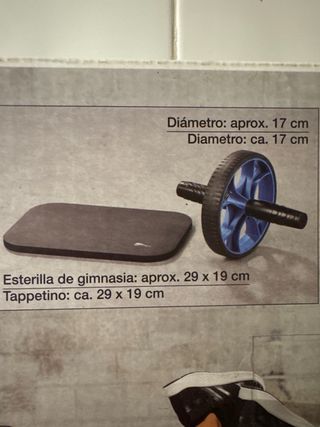 Juego de esterilla y rodillo abdominal con mangos ergonómicos de la marca Crivit (Lidl). La rueda está perfecta y la esterilla tiene marcas de algún objeto que ha tenido encima. Tengo otra igual y llevo tres meses usándola con un tutorial de youtube, diez minutos TODOS LOS DÍAS y ya lo estoy notando.