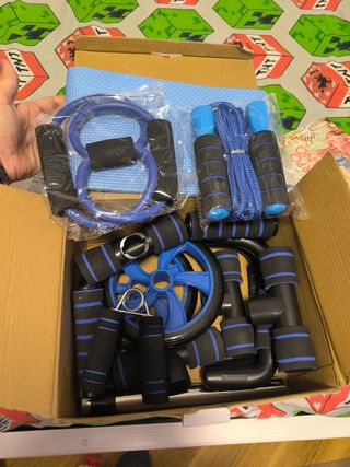 Kit deporte compuesto por 5 elementos - Esterilla de color azul yoga - Mancuernas de 2,5kg cada una - Kit gomas elásticas diferentes pesos con agarres - Rueda abdominal - Guantes deporte Todo comprado en Decathlon. Podéis consultar precio y está demasiado barato