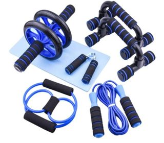 Kit de entrenamiento para casa con varios accesorios. - Rodillo para abdominales con mangos acolchados. - Cuerda de saltar con mangos de espuma. - Bandas de resistencia. - Esterilla de yoga azul.