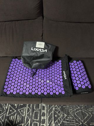Set de esterilla y almohada de acupresión LIXADA. - Color morado con base negra. - Incluye bolsa de transporte. - Diseño con múltiples púas para acupresión.
