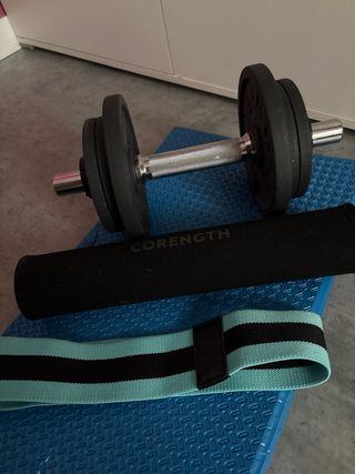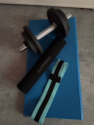 Pack de equipamiento deportivo en muy buen estado. - Mancuerna con discos. - Banda elástica de resistencia. - Esterilla azul para ejercicios.