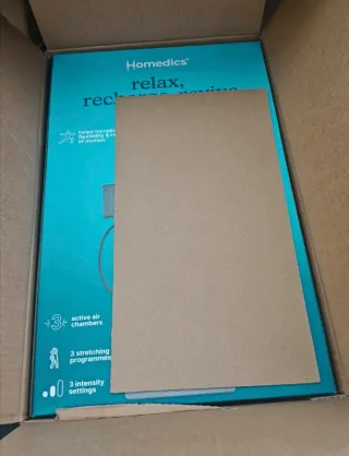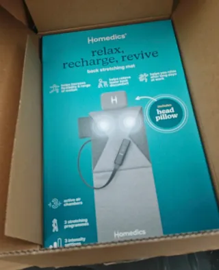 se envía con su caja de envío, Totalmente Nueva. muy útil. Esterilla de masaje de espalda Homedics. - Ayuda a aumentar la flexibilidad y el rango de movimiento. - Alivia el dolor lumbar. - Relaja después de largas jornadas de trabajo. - Incluye almohada para la cabeza. - Cuenta con 3 cámaras de aire activas. - Dispone de 3 programas de estiramiento. - Ofrece 3 ajustes de intensidad.