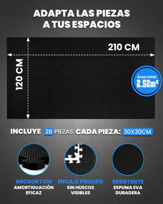 Set de 28 piezas de esterillas de puzzle para suelo de gimnasio. Cada pieza tiene un grosor de 1 cm. - Ideal para proteger el suelo y amortiguar. - Fácil de montar y desmontar. - Incluye guía de ejercicios en E-book.